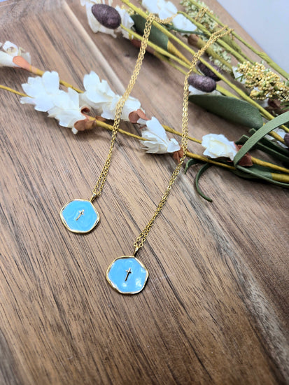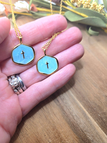The focal point is a beautiful, aqua cross pendant, adding a touch of timeless grace to the piece. The dainty nature of the chain enhances the overall femininity of the necklace, making it a perfect accessory for both casual and formal occasions.