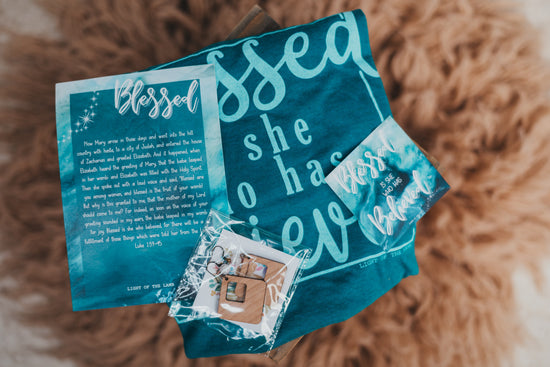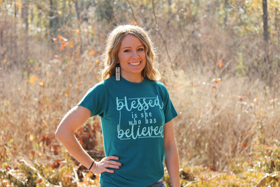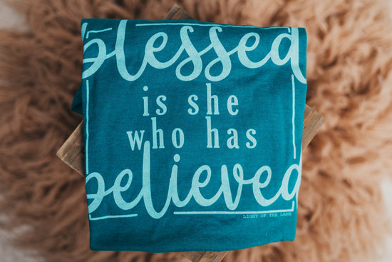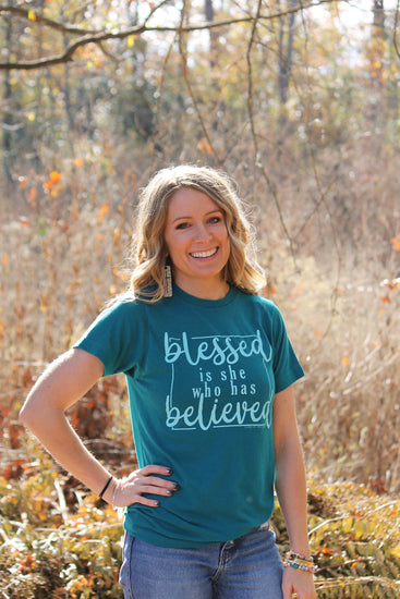 Introducing our cozy teal Christian tee, designed to envelop you in comfort while carrying a powerful message of faith and blessing. This tee features the uplifting words "Blessed is she who has believed," beautifully displayed against the serene backdrop of teal.
