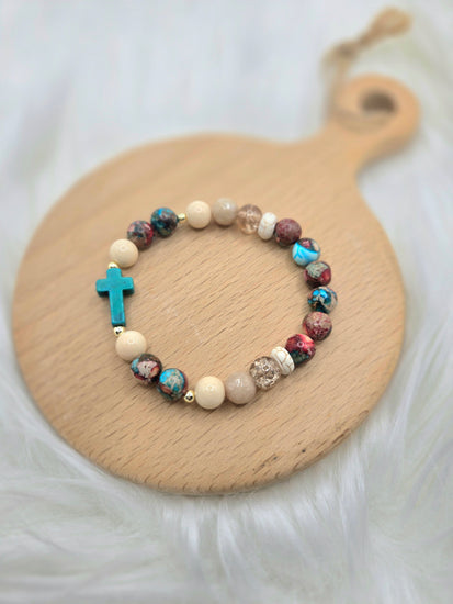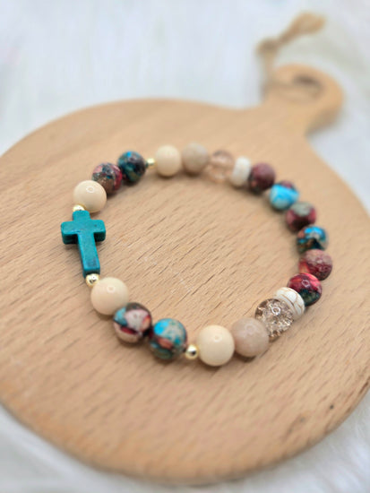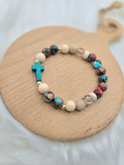 This bracelet reflects a heart on fire for God and a spirit led by Him. Centered with a teal cross, itβs a wearable reminder to stand strong and speak truth.