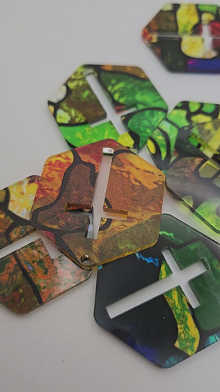 Our Hexagon Cross Earrings are the perfect blend of modern style and timeless faith. Made from stunning mosaic-style acrylic, each pair catches the light beautifully, showcasing a unique mix of color and texture. The bold hexagon shape paired with the delicate cross cutout makes these earrings a meaningful statement piece — lightweight, stylish, and full of purpose. A reminder of the beauty found in Christ, designed to go with you wherever you shine!