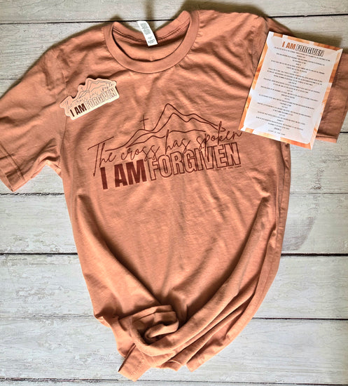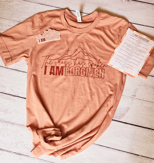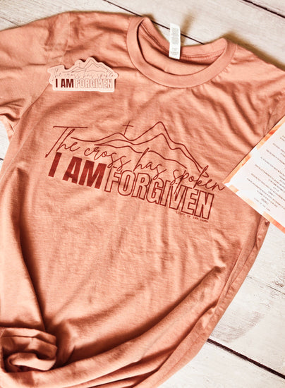 This terracotta-colored tee carries a powerful message with a beautifully subtle design. The front reads "The cross has spoken, I am forgiven" in a darker rust-colored ink, creating a soft contrast that complements the warm tone of the fabric.