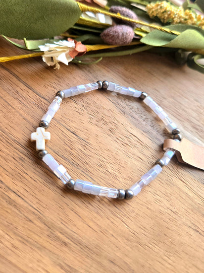 Light and sweet with a touch of shimmer—this bracelet features a mix of iridescent seed beads and metallic accents, finished with a tiny white cross that symbolizes faith in a beautifully delicate way. The subtle blue-purple tones catch the light effortlessly, adding a soft sparkle to your wrist.