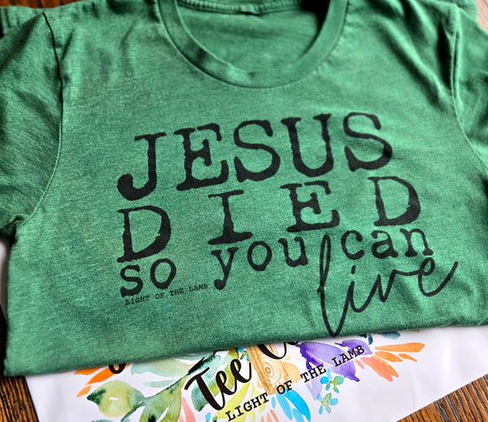 Our “Jesus Died So You Can Live” tee is a bold yet heartfelt reminder of the sacrifice that changed everything. Designed to spark conversation and point hearts back to the gospel.