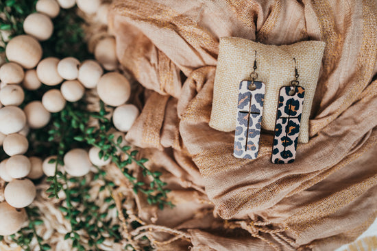 Our popular wooden cross earrings are now available in a fun leopard print. Very lightweight, printed wood.