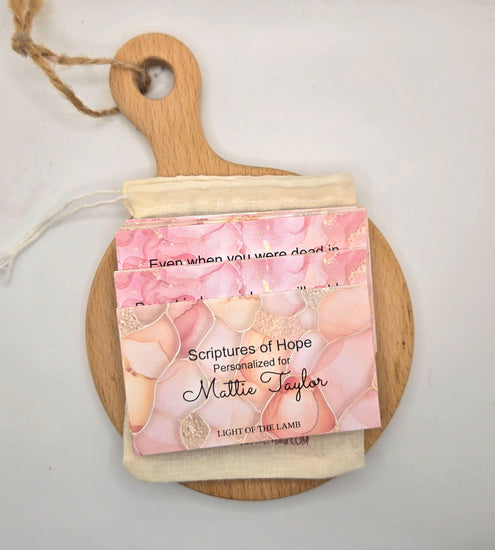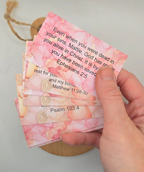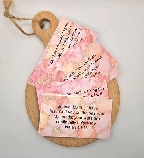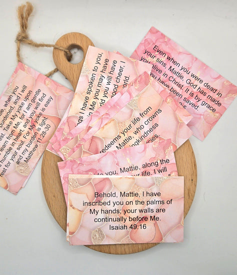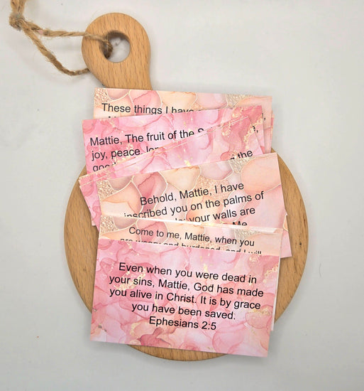 Encourage and uplift the women and teen girls in your life with this custom set of 30 personalized scripture cards, each featuring their name within a powerful Bible verse. Designed with three elegant blush and pink-toned backgrounds, these cards provide daily inspiration and a beautiful reminder of God’s love and promises.