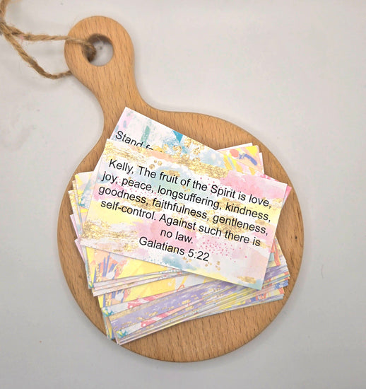 Inspire and uplift with this custom set of 30 personalized scripture cards, each featuring their name within a powerful Bible verse. Designed with six vibrant backgrounds accented with gold, this set brings a bold, artistic touch to daily encouragement and faith-filled reminders.