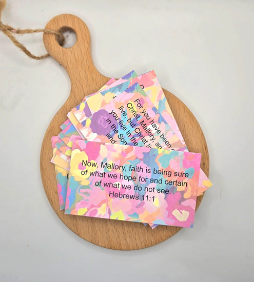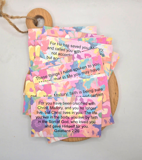 Bring joy and encouragement with this custom set of 30 personalized scripture cards, each featuring her name within a powerful Bible verse. Designed with three vibrant abstract floral backgrounds, these cards are a beautiful way to be reminded of God’s love, strength, and promises every day.