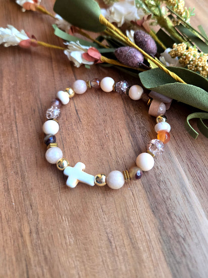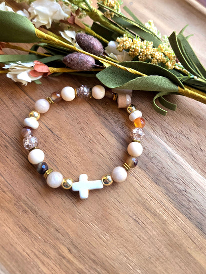 A delicate blend of soft neutral hues, sparkling accents, and a beautiful white cross centerpiece makes this bracelet a timeless reminder of faith. Designed with mixed beads including frosted neutrals, gold metallic accents, and shimmering textured pieces, it adds the perfect touch of elegance to any outfit.
