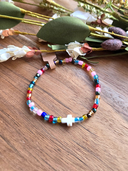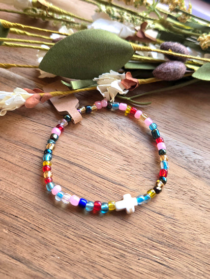 Bright, cheerful, and full of delight — this bracelet features a joyful mix of colorful seed beads centered around a tiny white cross that symbolizes simple and steadfast faith. Every bead brings a pop of color, making this piece a reminder to approach each day with the wonder and joy of a child of God.