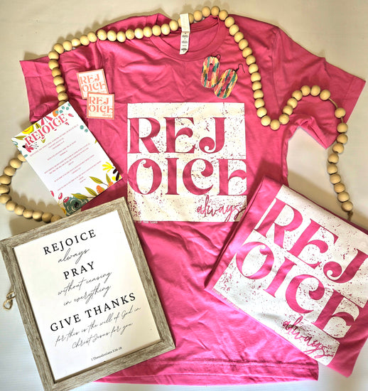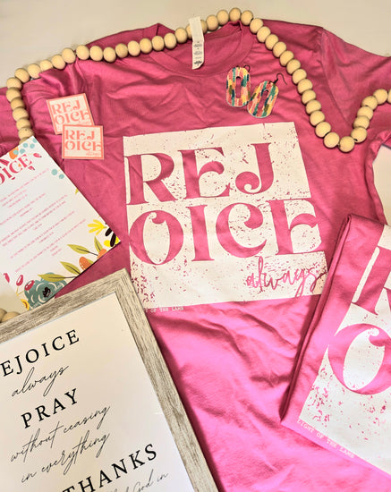 Elevate your style with our bold Rejoice Tee. This eye-catching shirt features a crisp white design with the inspiring message "Rejoice Always" prominently displayed on the front. Crafted for comfort and durability, this tee is perfect for expressing your faith in a fashionable way. Ideal for everyday wear, it’s a vibrant addition to any wardrobe.