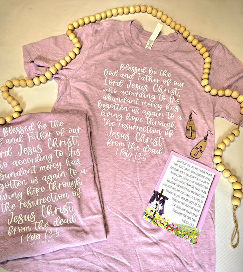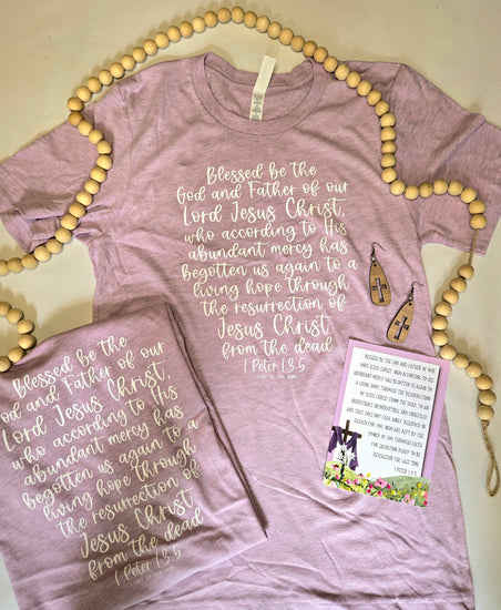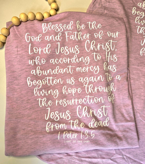 This tee is perfect for everyday wear, church gatherings, or casual outings, offering a gentle reminder of God's promises and the living hope we have in Christ. The light lavender color adds a touch of serenity and grace, making this tee both a statement of faith and a stylish addition to any wardrobe.