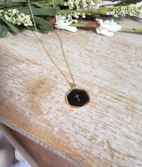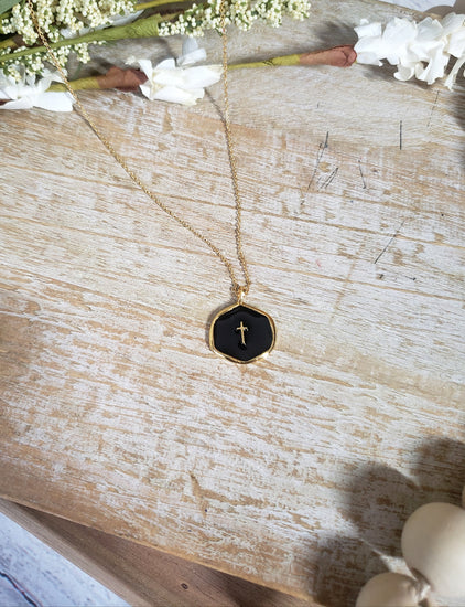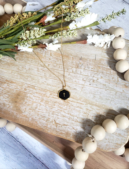 The focal point is a beautiful, black cross pendant, adding a touch of timeless grace to the piece. The dainty nature of the chain enhances the overall femininity of the necklace, making it a perfect accessory for both casual and formal occasions.