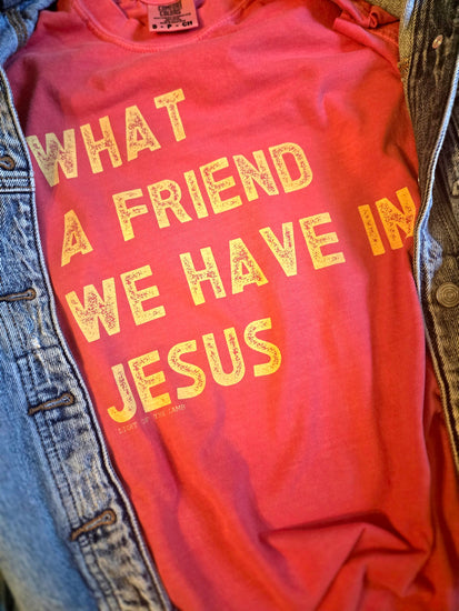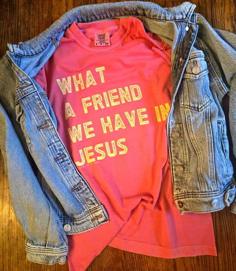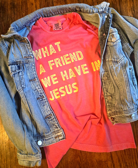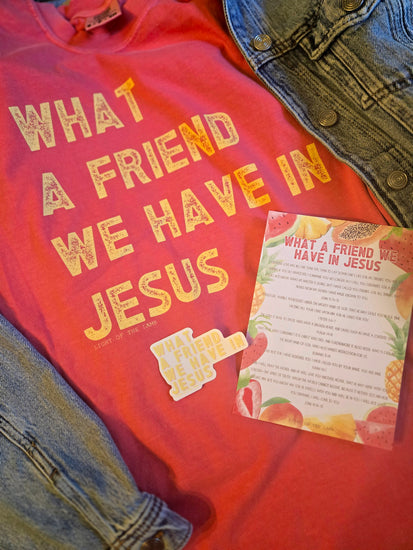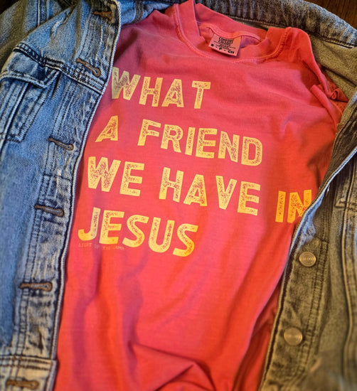 Celebrate the comfort and companionship of Christ with this vibrant faith-filled tee. Featuring the cherished hymn lyrics “What a Friend We Have in Jesus” in sunny yellow ink, this design stands out beautifully against the rich watermelon Comfort Colors tee — bold, joyful, and full of life.
